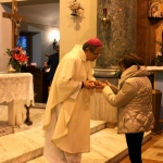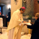 Durante l’offertorio sono stati portati all’altare numerosi oggetti simbolo dell’azione quotidiana dell’ASMO nella nostra città: il camice dei medici ed operatori sanitari che assistono e visitano gli ammalati, le chiavi degli automezzi, fondamentali per accompagnare chi ha bisogno di cure negli ospedali di Ancona, Teramo, Ascoli, un anthurium, pianta simbolo dell’associazione donato al vescovo Carlo, ed una pergamena con scritti i nomi degli amici sostenuti dall’ASMO nel corso dei suoi 13 anni di vita.