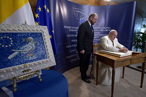 Il Papa ha chiaramente indicato alcune questioni che devono diventare priorità sulla scena europea. Ma prima ancora ha presentato i criteri di una vera politica umana. Nel Parlamento Ue ha affermato in modo chiaro che occorre mettere la “persona dotata di una dignità trascendente” al centro delle politiche. La persona, quindi, e non soltanto l’economia, deve diventare sempre più il principale criterio politico. La dignità della persona – e conseguentemente i diritti umani fondati sulla natura stessa della persona – è l’obiettivo da perseguire, come poi ha fatto notare nel discorso rivolto al Consiglio d’Europa, anche in relazione alla costruzione della pace.
