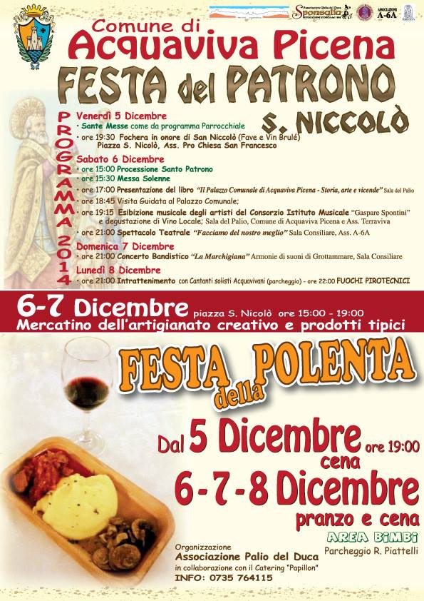 Si partirà il 05 dicembre con i Festeggiamenti in onore del Santo Patrono Niccolò del borgo medievale. La sera di venerdì 05 dicembre alle ore 19:30 ci sarà la tradizionale fochera in onore del Santo Patrono e prenderà il via – presso il Parcheggio R. Piattelli – la Festa della Polenta organizzata dall’Ass. Palio del Duca, che terminerà l’08 dicembre.
