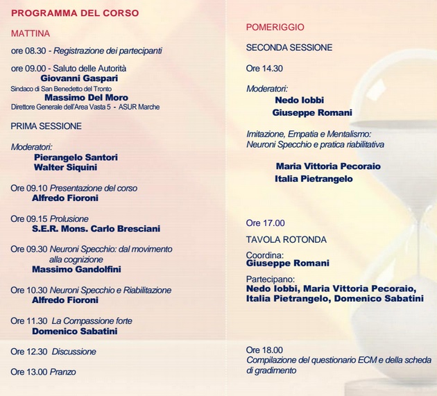 DIOCESI – “Neuroni Specchio e riabilitazione” è questo il tema dell’evento formativo organizzato dall’ Unità Operativa di Medicina Fisica e Riabilitativa dell’ Area Vasta 5 di San Benedetto del Tronto e dalla locale sezione Diocesana dell’Associazione Medici Cattolici Italiani, presso l’Auditorium comunale di San Benedetto del Tronto, venerdì 5 Dicembre 2014.