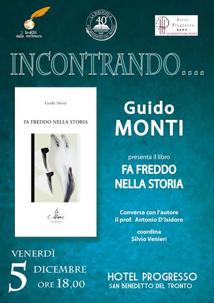 SAN BENEDETTO DEL TRONTO – Uno straordinario viaggio nelle stagioni della vita raccontate attraverso le venature di una scrittura originale e pregna di suggestioni è quanto si potrà vivere nel corso della presentazione di “Fa freddo nella storia” (Stampa 2009), l’ultima fatica del poeta Guido Monti in programma venerdì 5 dicembre, alle ore 18, nella sala congressi dell’Hotel Progresso di San Benedetto del Tronto. L’iniziativa, promossa dall’associazione culturale “I luoghi della Scrittura” e dalla libreria “Bibliofila” di Mimmo Minuto, vedrà la partecipazione, tra gli altri, del docente dell’Università di Macerata prof. Antonio D’Isidoro e di Silvio Venieri, che dialogheranno con Monti nativo proprio del Piceno, ma da anni in Emilia.