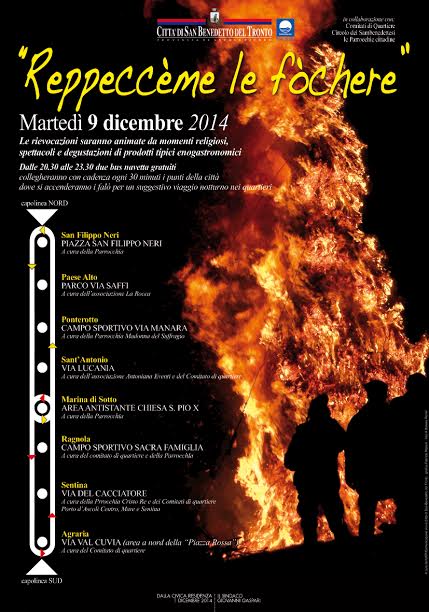 Dalle 20,30 alle 23,30 di martedì 9 dicembre il bus gratuito messo a disposizione dalla ditta Fratarcangeli Cocco (che gestisce il servizio scuolabus cittadino) collegherà i punti della città dove si accenderanno le fochere: piazza San Filippo Neri, parco di via Saffi, campo sportivo di via Manara, via Lucania, area antistante la Chiesa di San Pio X, campo sportivo di piazza Sacra Famiglia, via del Cacciatore in zona Sentina e via Val Cuvia in zona Agraria.