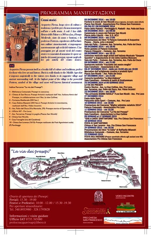 La manifestazione curata dall’associazione culturale Le Due Colline,in collaborazione con l’A.I.A.P. ed il patrocino dell’Amministrazione Comunale resterà visitabile fino al 06 gennaio con i seguenti orari: Feriali 15.00\19.00, Festivi e prefestivi 10.00\12.00-15.30\19.30. Saranno ben 10 le tappe del suggestivo percorso itinerante: 1- Biblioteca Comunale, 2- San rocco, 3- Fortezza medievale,4- Palazzo Dalma Massetti (Ass. Videoincontri) ,5- Presepe storico di Sponsalia (Ass. Palio del Duca) , 6- Ufficio I.A.T. (Ass. Pro Loco), 7- Piazza San Nicolò (Ass. Terraviva), 8- Chiesa di S. Nicolò, 9- Casa Travaglini e 10- Convento di San Lorenzo (Frati Agostiniani Scalzi).