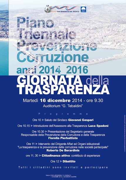 SAN BENEDETTO DEL TRONTO – Tutti i cittadini, singolarmente o in forma associata, forze politiche e sindacali, istituzioni sono invitati a partecipare martedì 16 dicembre con inizio alle ore 9,30 all’auditorium “Tebaldini” alla “Giornata della trasparenza”.
