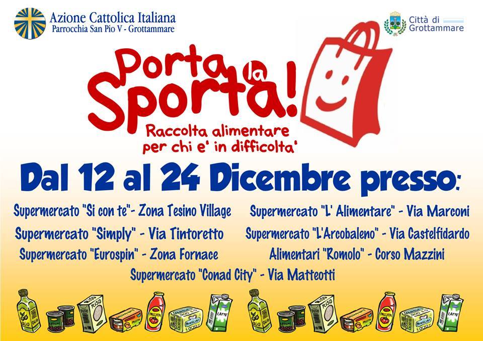 GROTTAMMARE – L’Azione Cattolica di Grottammare, dopo aver vissuto domenica 7 dicembre la giornata dell’adesione, da ieri ha fatto partire ufficialmente la seconda edizione di “Porta la Sporta”, una raccolta alimentare per le persone che si trovano in difficoltà.
