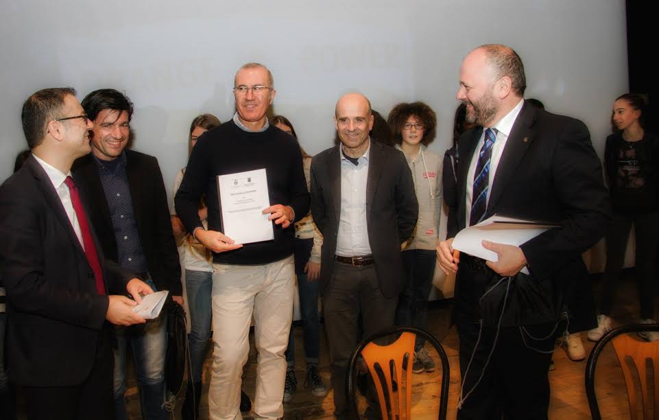 erba e non della società rivierasca, puntualmente sottolineati da clip video suggestive che hanno emozionato e commosso il pubblico che ha riempito il Teatro Concordia in ogni ordine di posto, c’è stato un momento che ha mandato in visibilio l’intera comunità della Collection: il primo cittadino Giovanni Gaspari, assieme al neo Presidente della Provincia Paolo D’Erasmo, alla presenza del Vice Sindaco Eldo Fanini e del Vice Presidente della Provincia Silvano Evangelisti, hanno siglato un protocollo d’intesa sul palco dell’evento riguardante la realizzazione del nuovo manto della pista del campo scuola di Atletica Leggera.
