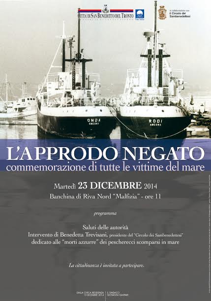 Il programma prevede la deposizione di una corona dinanzi al Monumento ai Caduti del Mare “Il Mare, il Ritorno” di Paolo Annibali. La cerimonia commemorativa, curata dal Circolo dei Sambenedettesi, sarà quest’anno dedicata alle “morti azzurre” , come viene definita la perdita di marittimi a bordo dei pescherecci scomparsi e mai più ritrovati.