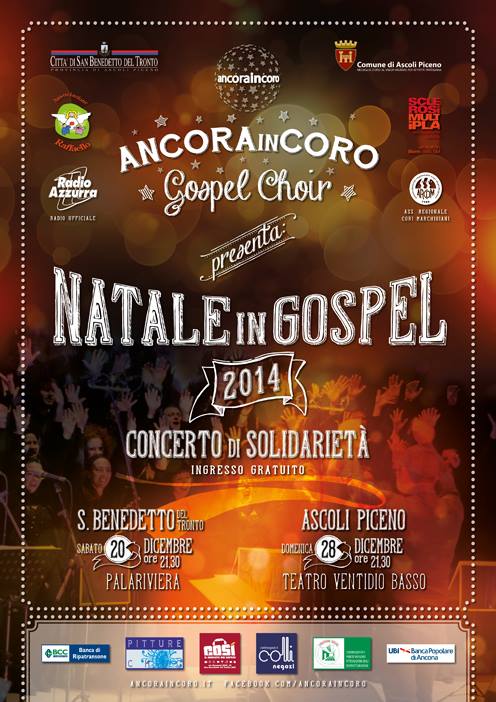 SAN BENEDETTO DEL TRONTO – Il Natale si veste di Gospel con gli ANCORAinCORO. Il conosciuto Gospel Choir riprenderà la stagione concertistica con “NATALE in GOSPEL“, le date previste sono sabato 20 dicembre ore 21:30 presso il Palariviera di San Benedetto del Tronto e domenica 28 dicembre ore 21:30 presso il Teatro Ventidio Basso di Ascoli Piceno. ANCORAinCORO Gospel Choir nasce nel settembre del 2010 dal nucleo principale del coro parrocchiale di San Giuseppe, in San Benedetto del Tronto, così come si era consolidato nel corso dei primi anni ’90 sotto la direzione artistica del Maestro Barbara Salibrici, prematuramente scomparsa all’inizio dello stesso anno.