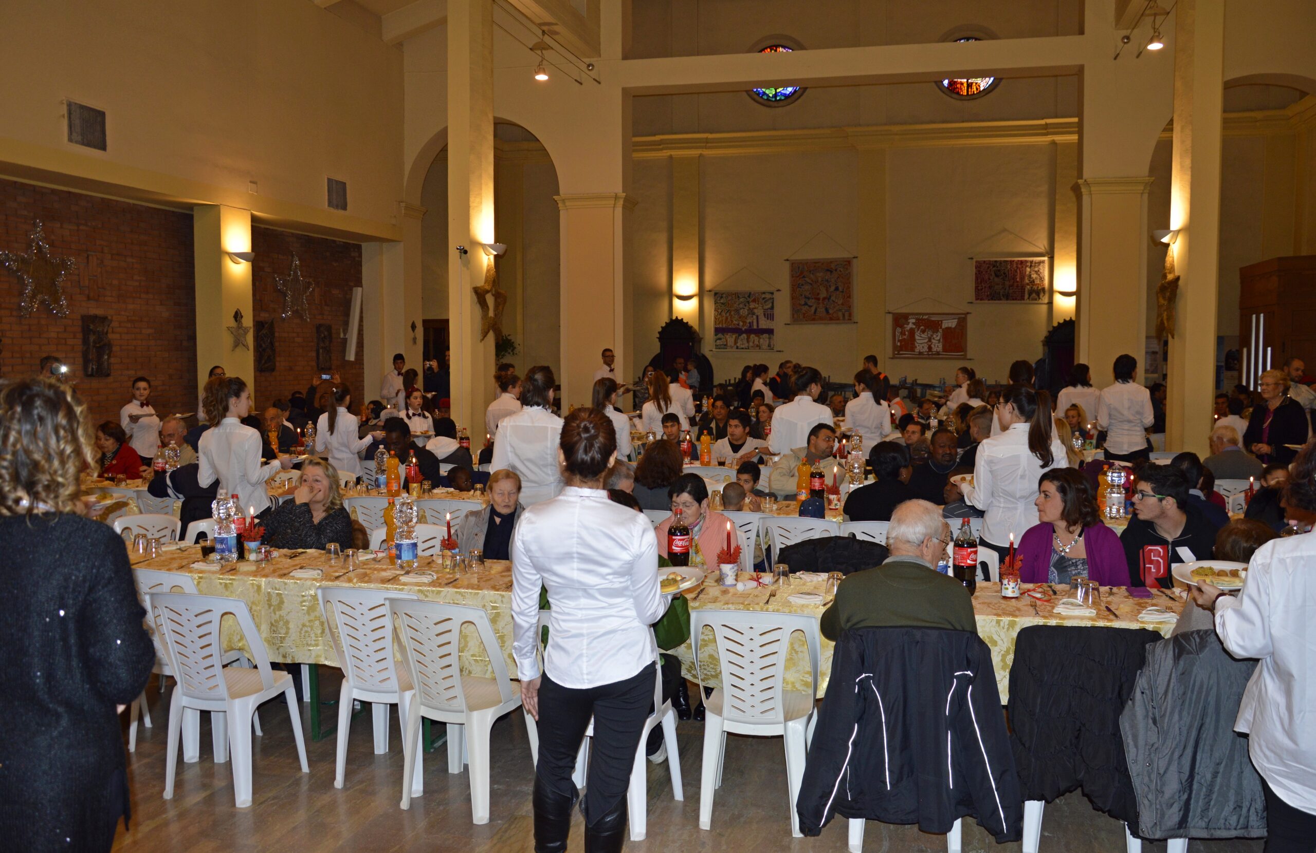 Ad augurare il buon appetito anche il sindaco Gaspari e presente anche il Pastore Angelo della chiesa Evangelica con un gruppo di ospiti, che ha augurato a tutti un vero Natale di amore. Don Gianni che ha ringraziato tutti, ha poi invitato tutti a momento di preghiera in silenzio, ognuno secondo la propria sensibilità, e così è iniziato il pranzo con l’ingresso dei camerieri attenti e impeccabili. Durante il pranzo è passato per un saluto anche il vescovo Carlo che ha potuto osservare tutte le attività che rendono possibile la realizzazione del pranzo dalla cucina ai lavapiatti, dal servizio alla preparazione cestini con ciò che avanza secondo le quantità preparate.