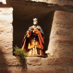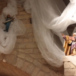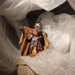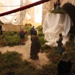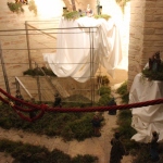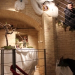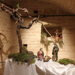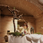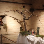 Rossi, da subito molto disponibile, ha potuto realizzare il presepe con la collaborazione dell’associazione “La Rocca” e l’associazione “Amici del Paese Alto” e spiega così il suo lavoro: «Dietro la natività ho inserito un tronco di vite, sopra al quale c’è un germoglio, portatore di vari significati: dal germoglio nasce la vite, che poi porterà frutto, fino all’ultima cena e tutto ciò che ne consegue. Un’altra ispirazione biblica, precisamente dal prologo del vangelo di Giovanni, “E pianterà una tenda in mezzo a voi”, la troviamo nella struttura sopra le nostre teste, che richiama proprio il velo di una tenda. I personaggi che vedi nelle nicchie sono i re magi e sono realizzati in cartapesta leccese; le altre figure no, ma pensiamo di portare i personaggi tutti nella stessa natura, in cartapesta, negli anni successivi. Sono ormai 5 anni che faccio il presepe qui alla Torre e l’impostazione di questo presepe così come quello degli altri anni è un’impostazione classica: troviamo quindi i personaggi soliti ma in un momento particolare, un momento riflessivo. La scenografia della Torre è già bella di per sé, con i mattoni e gli archetti che incorniciano il tutto e creano una bellissima atmosfera. L’insieme secondo me risulta abbastanza classico, per i personaggi, per il muschio: ma se uno guarda bene c’è la strada segnata dal muschio che non è chiusa, rimane aperta verso lo spettatore, perché i personaggi del presepe compiono un cammino alla ricerca del mistero dell’incarnazione e della salvezza. La statuine sono molto curate: guarda questo giovane, realizzato in cartapesta ma col dettaglio della brocchetta di ceramica, o il venditore di frutta col suo cesto; è tutto molto pieno di dettagli, è una ricerca curata. I re magi poi sono assolutamente preziosi: i loro vestiti brillano e riflettono la luce».