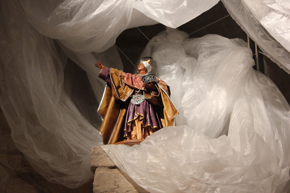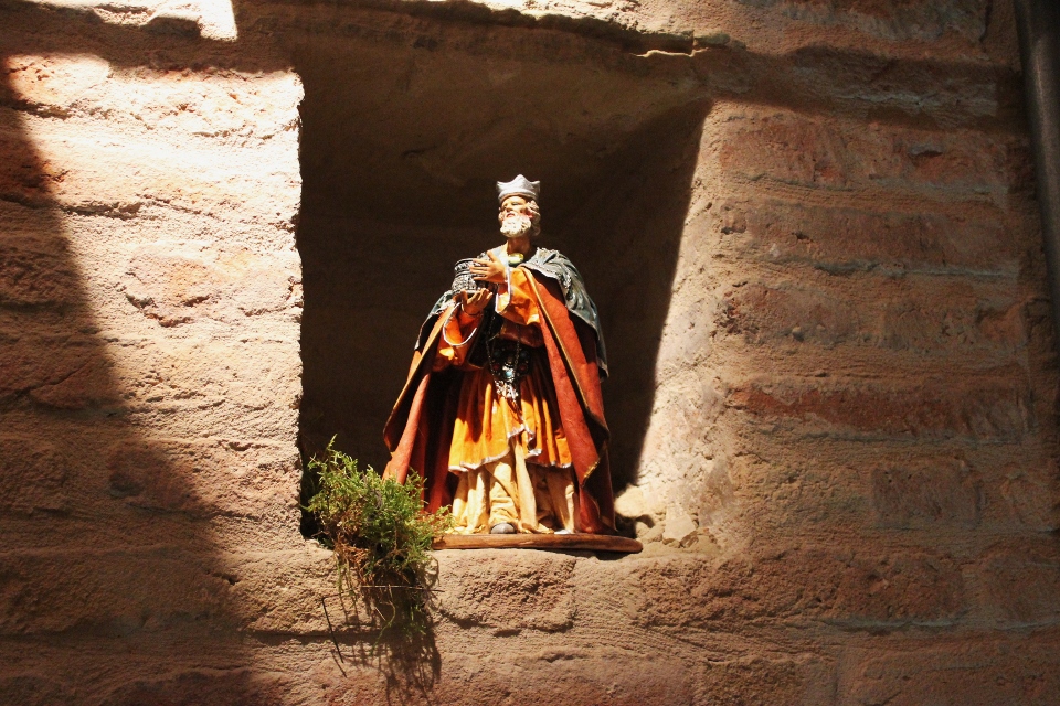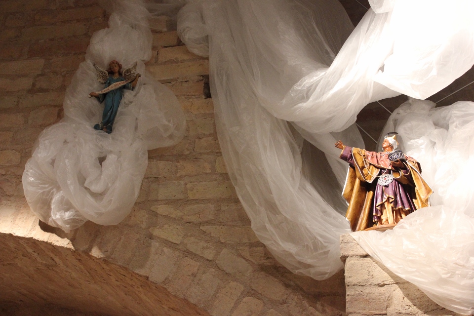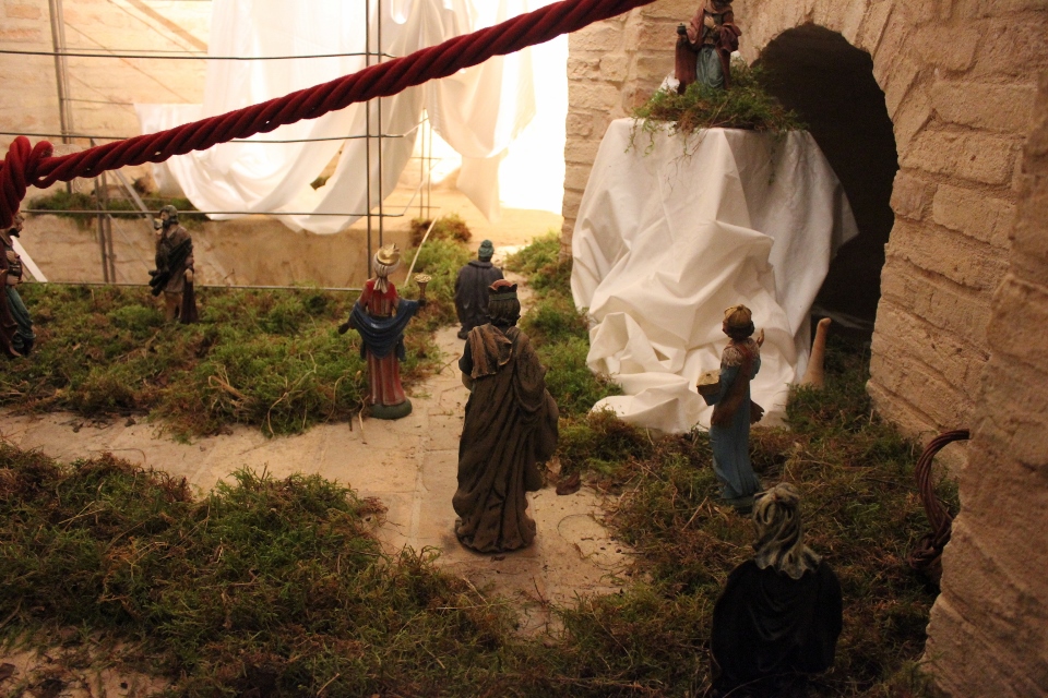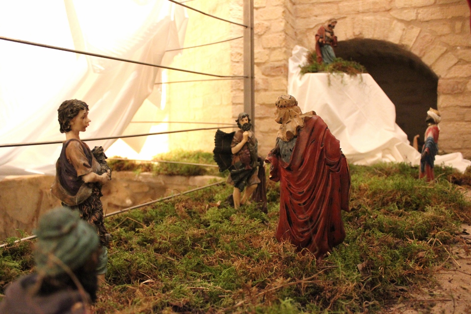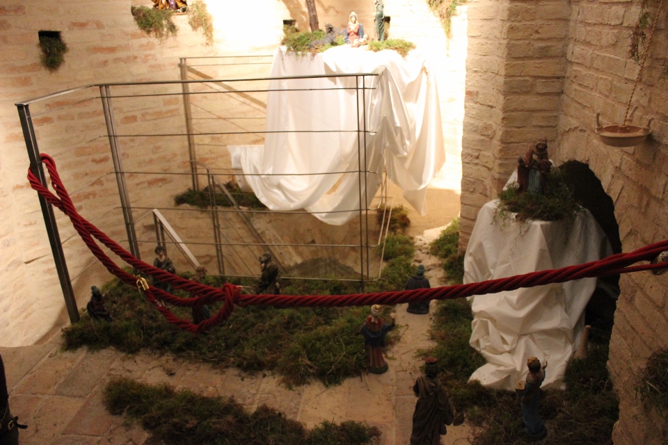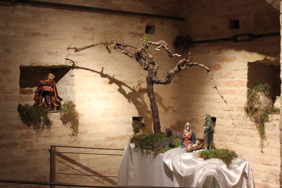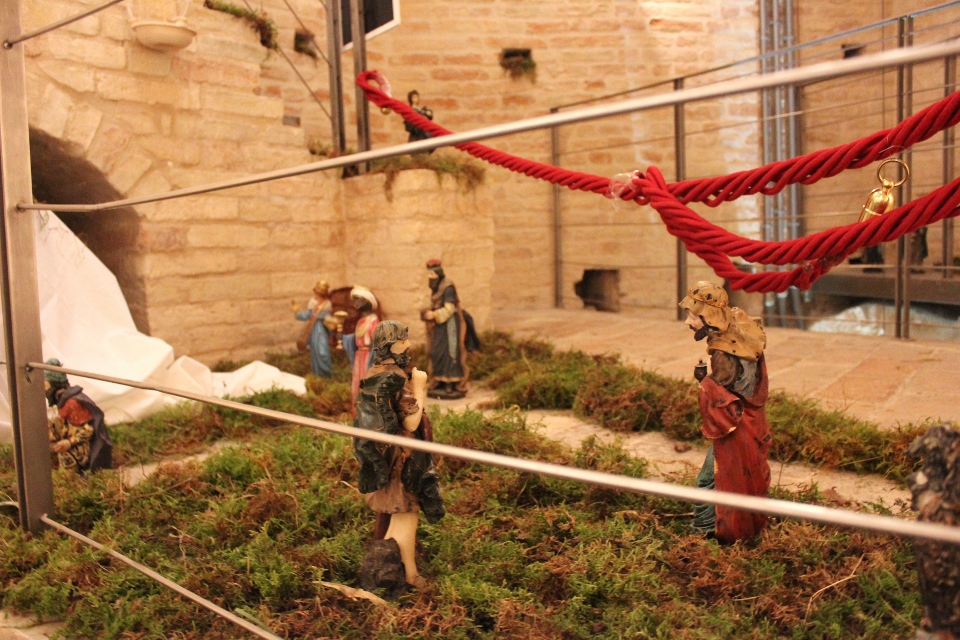Rossi, da subito molto disponibile, ha potuto realizzare il presepe con la collaborazione dell’associazione “La Rocca” e l’associazione “Amici del Paese Alto” e spiega così il suo lavoro: «Dietro la natività ho inserito un tronco di vite, sopra al quale c’è un germoglio, portatore di vari significati: dal germoglio nasce la vite, che poi porterà frutto, fino all’ultima cena e tutto ciò che ne consegue. Un’altra ispirazione biblica, precisamente dal prologo del vangelo di Giovanni, “E pianterà una tenda in mezzo a voi”, la troviamo nella struttura sopra le nostre teste, che richiama proprio il velo di una tenda. I personaggi che vedi nelle nicchie sono i re magi e sono realizzati in cartapesta leccese; le altre figure no, ma pensiamo di portare i personaggi tutti nella stessa natura, in cartapesta, negli anni successivi. Sono ormai 5 anni che faccio il presepe qui alla Torre e l’impostazione di questo presepe così come quello degli altri anni è un’impostazione classica: troviamo quindi i personaggi soliti ma in un momento particolare, un momento riflessivo. La scenografia della Torre è già bella di per sé, con i mattoni e gli archetti che incorniciano il tutto e creano una bellissima atmosfera. L’insieme secondo me risulta abbastanza classico, per i personaggi, per il muschio: ma se uno guarda bene c’è la strada segnata dal muschio che non è chiusa, rimane aperta verso lo spettatore, perché i personaggi del presepe compiono un cammino alla ricerca del mistero dell’incarnazione e della salvezza. La statuine sono molto curate: guarda questo giovane, realizzato in cartapesta ma col dettaglio della brocchetta di ceramica, o il venditore di frutta col suo cesto; è tutto molto pieno di dettagli, è una ricerca curata. I re magi poi sono assolutamente preziosi: i loro vestiti brillano e riflettono la luce».