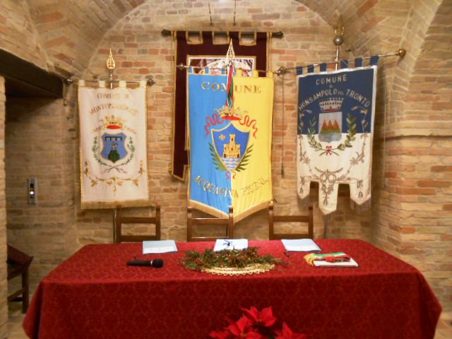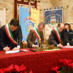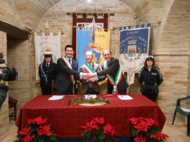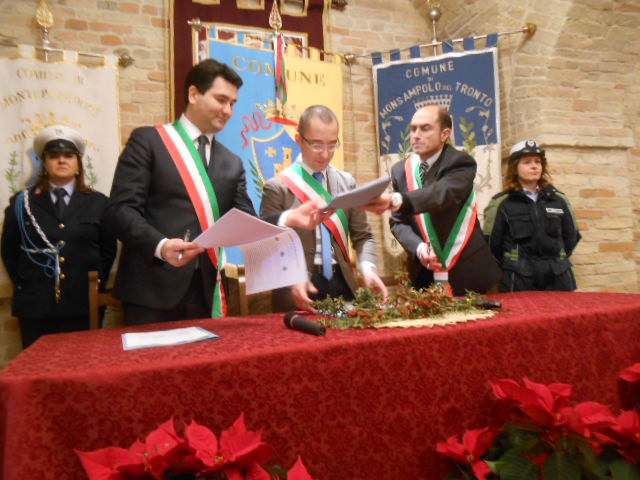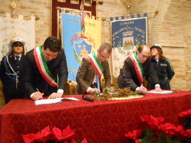 ACQUAVIVA PICENA – Lunedì 29 dicembre 2014, alle ore 12:00, nella Sala del Palio, presso il palazzo comunale, i sindaci dei comuni di Acquaviva Picena, Monsampolo del Tronto e Monteprandone, rispettivamente Pierpaolo Rosetti, Pierluigi Caioni e Stefano Stracci, hanno firmato l’atto costitutivo e lo statuto dell’Unione dei Comuni Piceni, essendo stato reso obbligo normativo la gestione in associazione di una serie di funzioni fondamentali, per i comuni con popolazione al di sotto dei 5000 abitanti, tramite la scelta di una delle tre forme di gestione proposte: la convenzione, la fusione e, appunto, l’unione. Alla data di scadenza per la gestione in associazione di tre funzioni, il 31 dicembre 2012, i comuni di Acquaviva e Monsampolo hanno messo in associazione le funzioni della protezione civile, dei servizi sociali e del catasto. Nel progetto tra i comuni di Acquaviva e Mosampolo si è inserito anche il comune di Monteprandone che, pur non avendo l’obbligo normativo, ha visto in questa unione un progetto lungimirante.