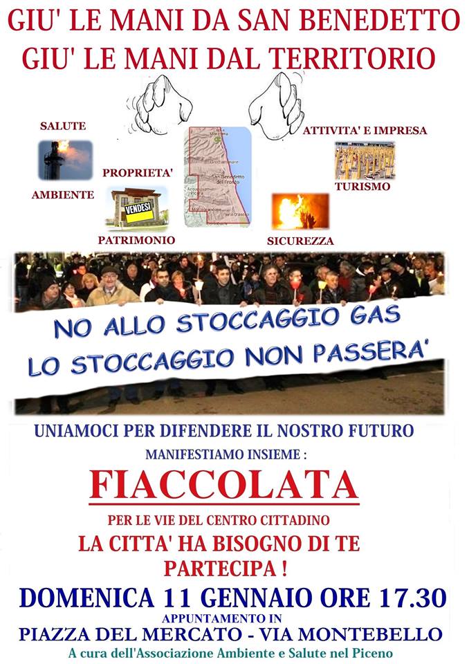 SAN BENEDETTO DEL TRONTO – Domenica 11 gennaio si terrà una fiaccolata per le vie di San Benedetto per manifestare contro la decisione di impiantare uno stoccaggio del gas in zona Porto d’Ascoli. La manifestazione promossa dall’associazione “Ambiente e Salute nel Piceno”, ha raccolto moltissime adesioni tra associazioni, associazioni di categoria e sindaci, coinvolto i comitati dei quartieri della zona direttamente interessata. Ma la realizzazione di questo impianto coinvolge tutta la città, per cui è fondamentale la continua attenzione e il coinvolgimento di tutti i cittadini. E’ una questione che non può lasciare indifferenti dato che vanno comprese le eventuali implicazioni per la salute, per l’ambiente e per la sicurezza, nonchè per l’immagine turistica della città stessa che un simile progetto se realizzato comporta per tutto il territorio. La fiaccolata attraverserà le vie del centro città partendo dalla piazza del mercato, via Montebello, alle ore 17.30. Al termine della fiaccolata in piazza Giorgini ci saranno degli interventi. La fase è delicata vista la fase in cui si trova il progetto e le procedure di autorizzazioni.