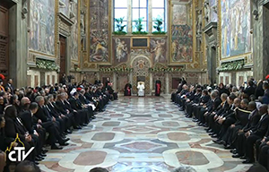 No alla “indole del rifiuto”. La strage di Parigi nasce da “una cultura che rigetta l’altro, recide i legami più intimi e veri, finendo per sciogliere e disgregare tutta quanta la società e per generare violenza e morte”. Il Papa ha iniziato il suo discorso con una parola: “Pace!”, come “prezioso dono di Dio” e nello tesso tempo come “responsabilità personale e sociale”. Partendo dal presepe, Francesco ha parlato di “cuore indurito dell’umanità, che fatica ad accogliere il Bambino”. Segno che “c’è un’indole del rifiuto che ci accomuna, che induce a non guardare al prossimo come ad un fratello da accogliere, ma a lasciarlo fuori dal nostro personale orizzonte di vita, a trasformarlo piuttosto in un concorrente, in un suddito da dominare”. Ad una “dimensione personale del rifiuto”, ha spiegato il Papa, “si associa inevitabilmente una dimensione sociale”, una “cultura che rigetta l’altro”: come nella strage di Parigi, in cui gli altri vengono visti come “oggetti” e l’essere umano “diventa schiavo” anche di “forme fuorviate di religione”. Alla radice c’è “un cuore corrotto, incapace di vedere e operare il bene, di perseguire la pace”.