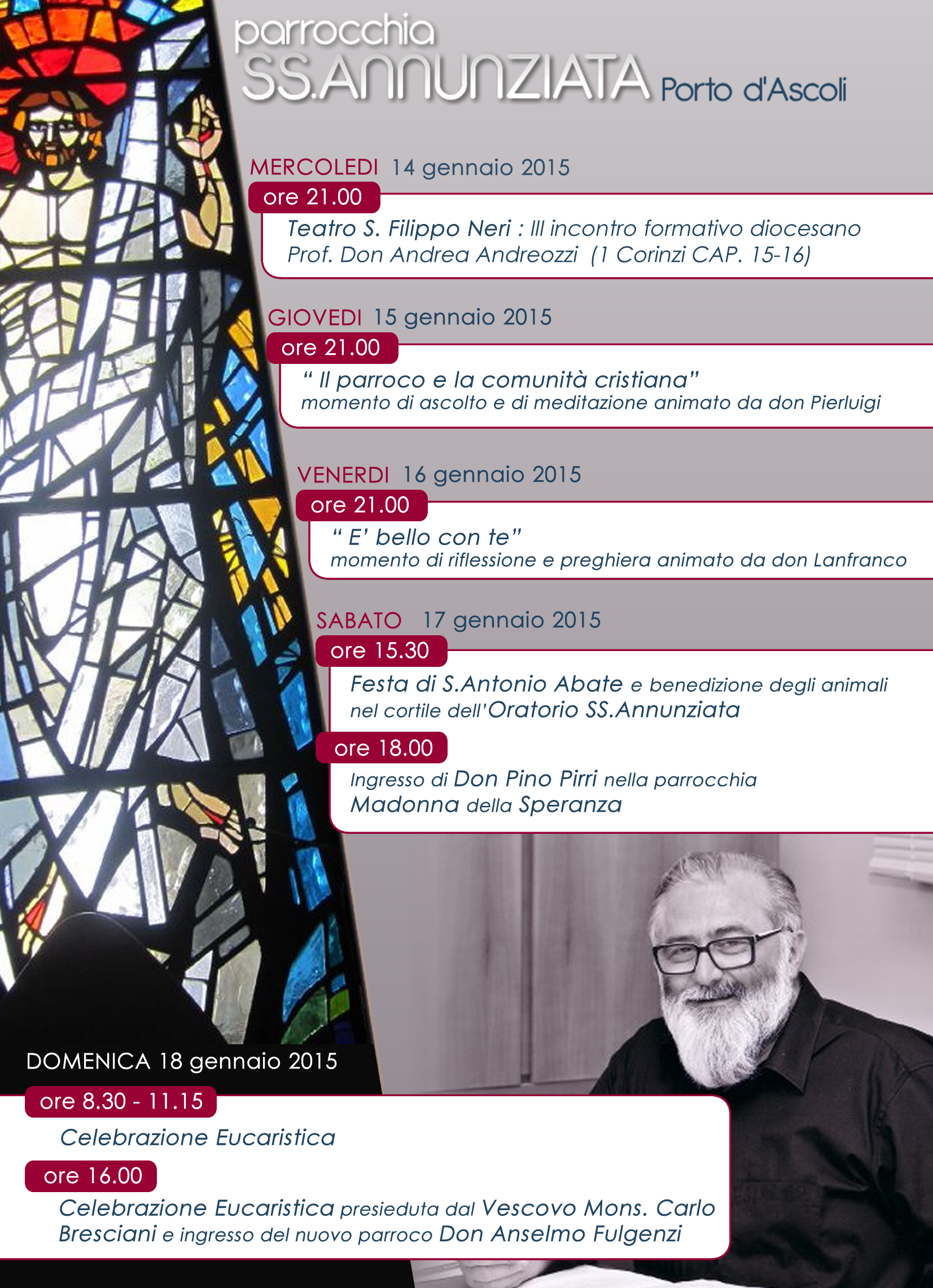 SAN BENEDETTO DEL TRONTO – La parrocchia della SS. Annunziata si prepara ad accogliere il nuovo parroco don Anselmo Fulgenzi. Sono due gli incontri per tutta la comunità parrocchiale proposti come occasione di ascolto e preghiera: giovedì 15 gennaio, alle 21.00 l’incontro è animato da don Pierluigi Bartolomei e offrirà una meditazione sul “parroco e la comunità cristiana”. Venerdì 16 gennaio, sempre alle 21.00 il momento di preghiera è animato da don Lanfranco Iachetti.