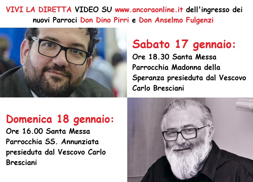 DIOCESI – Sabato 17 e domenica 18 gennaio la nostra diocesi vivrà due momenti importanti: l’ingresso nella Parrocchia Madonna della Speranza del nuovo Parroco Don Dino Pirri e l’ingresso nella Parrocchia SS. Annunziata di Don Anselmo Fulgenzi.