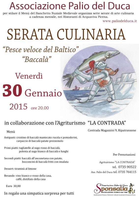 Presso il Ristorante “La Contrada ” Venerdi 30 Gennaio ore 20,00 l’estro dello chef proporrà la prima delle sette Serate “Serata del pesce veloce del baltico”, il Baccalà.