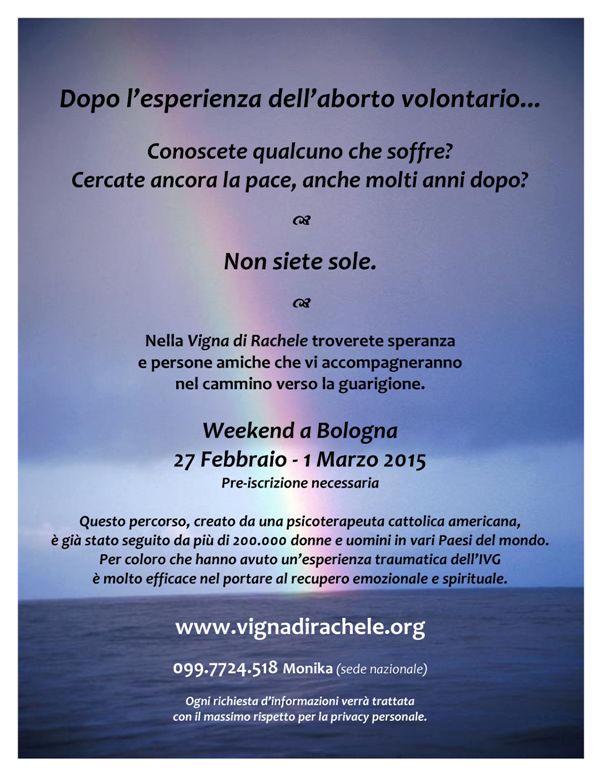 La Vigna di Rachele è attiva in diversi paesi del mondo: Stati Uniti, Canada, Nuova Zelanda, Australia, diversi Paesi dell’Europa, Hong Kong, Taiwan, Africa e America Latina con più di 90 equipes, in Italia, la coordinatrice è Monika Rodman Montanaro. Il prossimo weekend, per chi vorrà partecipare, si terrà dal 27 febbraio al primo marzo, a Bologna. Per informazioni visitare il sito http://vignadirachele.org/ o inviare una mail a info.vignadirachele@yahoo.it . Per il clero http://vignadirachele.org/esperienze/espersacerdoti.html www.progettorachele.org