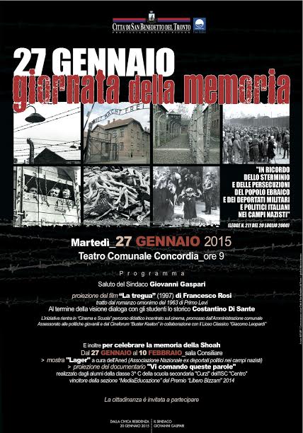 Quest’anno sono diverse le iniziative programmate dall’Amministrazione comunale per commemorare la ricorrenza. Martedì 27 gennaio, alle 9, al Teatro Comunale Concordia si terrà la proiezione del film “La tregua” di Francesco Rosi, tratto dal romanzo omonimo di Primo Levi. Dopo il saluto del Sindaco Giovanni Gaspari e la proiezione del film, lo storico Costantino Di Sante dialogherà con gli studenti.