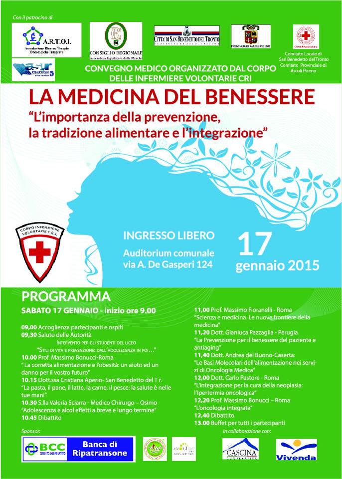 Lo scorso 17 Gennaio 2015 si è svolto presso l’Auditorium Comunale di San Benedetto del Tronto, il Convegno Medico, voluto ed organizzato dal Corpo delle Infermiere Volontarie della Croce Rossa di San Benedetto del Tronto, guidate dall’Ispettrice S.lla Rita Straccia, dal titolo “La Medicina del Benessere – L’importanza della prevenzione, la tradizione alimentare e l’integrazione”.