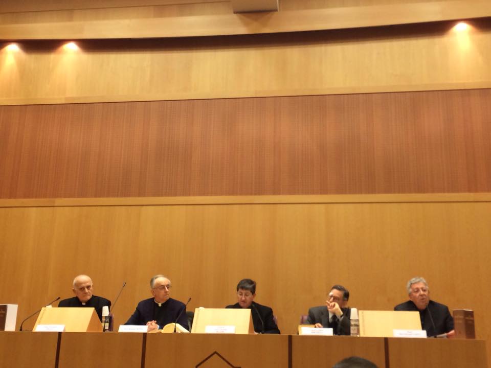ROMA – Si è svolta lunedì 26 gennaio alle ore 16.30 presso l’Aula Magna dell’Istituto Patristico Augustinianum di Roma la presentazione de La Sacra Bibbia – Testo bilingue. Latino-Italiano, pubblicata dalla Libreria Editrice Vaticana a cura di monsignor Fortunato Frezza, canonico vaticano e dottore in Sacra Scrittura presso il Pontificio Istituto Biblico di Roma, già sottosegretario del Sinodo dei Vescovi. Numerosi gli alti prelati presenti in sala: fra gli altrii cardinali Baldisseri, Farina, O’Brien e Saraiva Martins; gli arcivescovi De Andrea, Farhat e Marra, il vescovo Fabene.