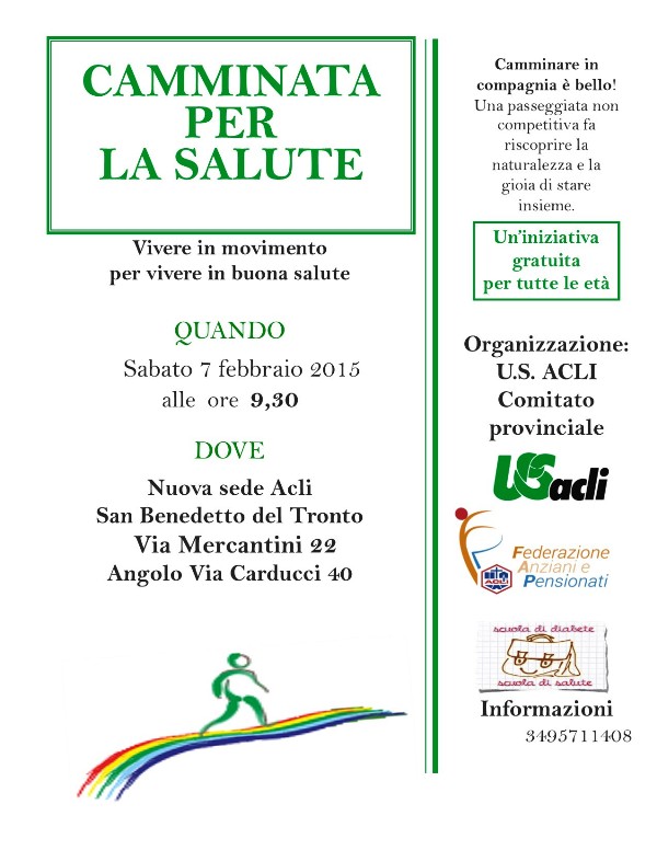 Il secondo appuntamento è fissato invece per sabato 7 febbraio alle ore 9,30 presso la nuova sede delle Acli a San Benedetto del Tronto (Via Mercantini 22, angolo via Carducci), sede dalla quale partirà una camminata della durata di circa un’ora.