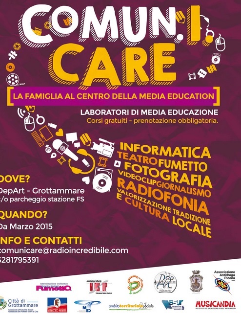 “Comun.I.care – La famiglia al centro della Media Education” interviene nel sostegno alla famiglia per mezzo della Media Education e prevede la realizzazione di un centro di media educazione a Grottammare, presso il DepArt. La struttura ospiterà attività mattutine per gli anziani, pomeridiane per i ragazzi e serali per gli adulti due giorni a settimana a partire da marzo 2015.