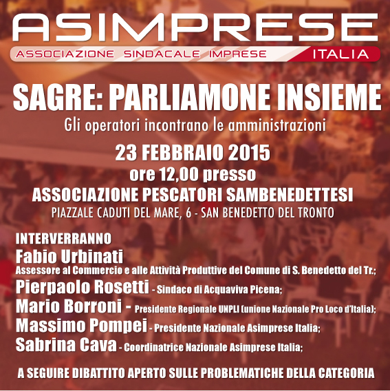 SAN BENEDETTO DEL TRONTO – L’Associazione Asimprese Italia organizza per il giorno 23 febbraio alle ore 12:00 presso la Sala dei Pescatori Sambenedettesi sita in Piazzale Caduti del Mare 6, un incontro pubblico dal titolo “Sagre: Parliamone insieme”.