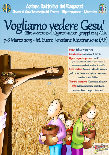 I nostri educatori ci hanno detto che le suore Teresiane, di cui saremo ospiti, sono famose per l’accoglienza e per la buona cucina e quindi sono sicuro che ci troveremo molto bene! Come potete vedere, sulla locandina del ritiro c’è Gesù crocifisso. Dalle sue mani cadono dei piccoli chicchi di grano che entrano nella terra dei nostri vasi per crescere e portare frutto; sullo sfondo ci sono tante spighe di grano dorate. Guardando Gesù crocifisso, vogliamo imparare da Lui a essere come il chicco di grano per fare della nostra vita un dono ed essere amici di ogni uomo!