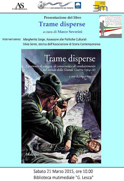 Si parte alla 10 alla Biblioteca Comunale “Giuseppe Lesca” con la presentazione della pubblicazione a cura di Marco Severini dal titolo “Trame disperse. Esperienze di viaggio, di conoscenza e di combattimento nel mondo della Grande Guerra (1914-18)”. Il volume raccoglie gli atti del convegno internazionale di studi tenutosi a novembre (28-30) a Fano, Senigallia e Castelbellino dedicato alla prima guerra mondiale. Abbracciando molteplici approcci disciplinari che spaziano dalla storia alla letteratura, dalla storia dell’arte alla linguistica, il volume racconta le vicende di uomini e di donne, celebri ma anche sconosciute, che vissero loro malgrado la prima grande tragedia del Novecento.