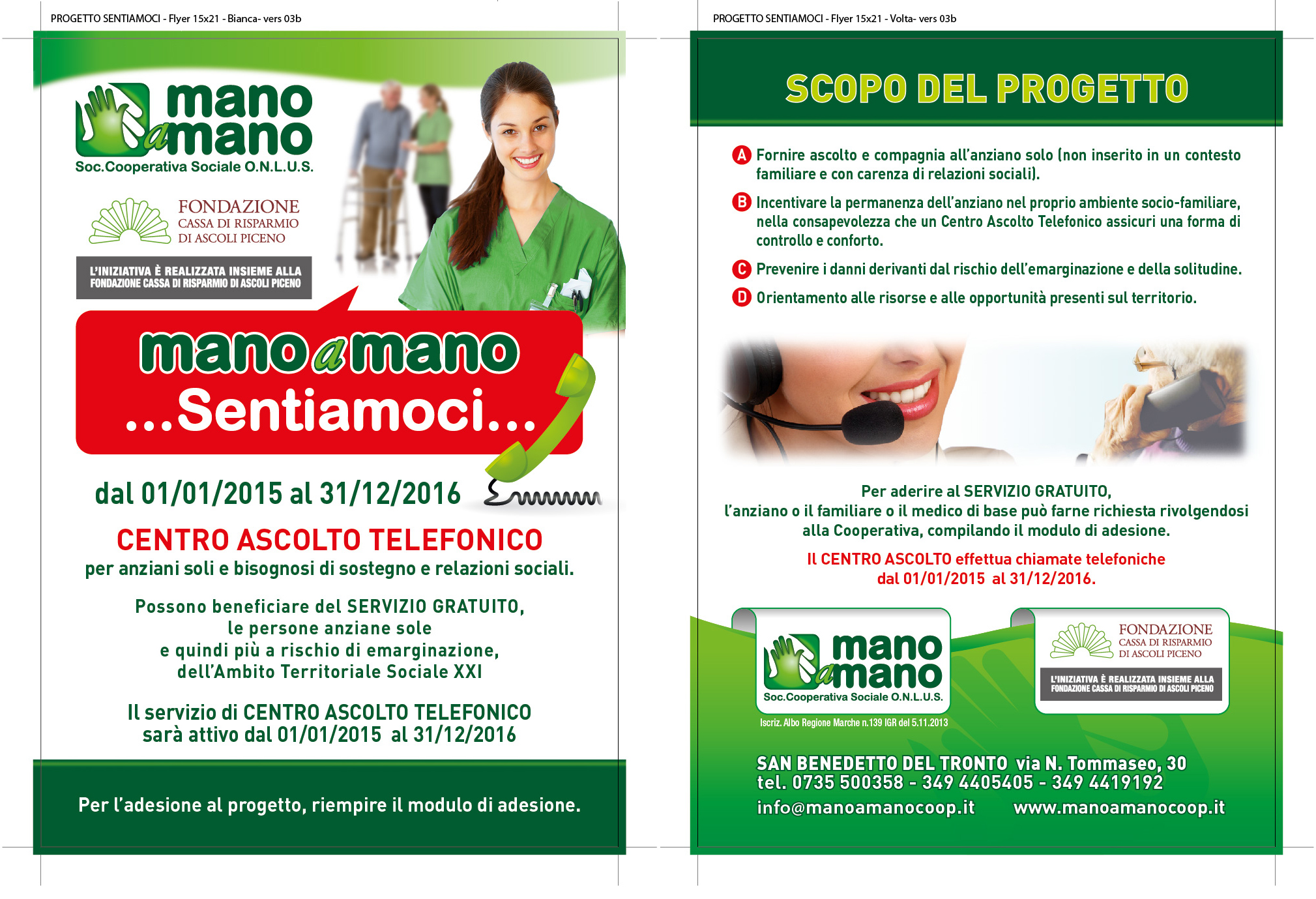 La Fondazione Cassa di Risparmio di Ascoli Piceno e Mano a Mano Società Cooperativa Sociale Onlus hanno scelto di mettere al centro del progetto “Mano a Mano…Sentiamoci” la comunità sociale, sia nella lettura dei suoi problemi, sia nella ricerca e nell’attuazione delle soluzioni possibili, attraverso la edificazione di reti ed il coinvolgimento del più ampio numero di soggetti che operano nel Terzo Settore. L’impegno condiviso è quello di generare un welfare di comunità che, ponendosi in relazione con la parte pubblica nonché con gli operatori economici che fossero interessati e disponibili, sia in grado di rispondere ai bisogni della comunità, affrontando rischi e sfide sociali, e rendendo la comunità stessa partecipe e responsabile e ponendo quindi le basi per un rinnovato clima di fiducia ispirato dal sentimento della condivisione e, soprattutto, dal senso di appartenenza ad una comunità che cerca al proprio interno le forze e le risorse per far fronte ai propri problemi ed alimentare il proprio futuro.