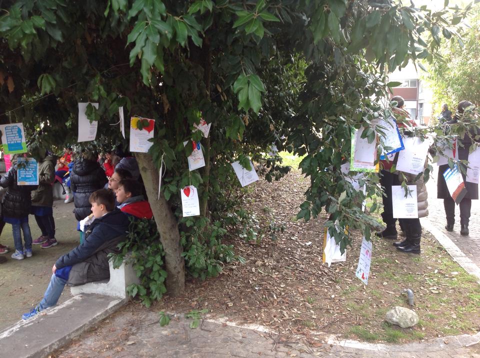 Durante la mattina ai bambini sono state riconsegnate le poesie realizzate in classe che sono poi state appese nel giardino di piazza Bambini del Mondo davanti al Municipio.