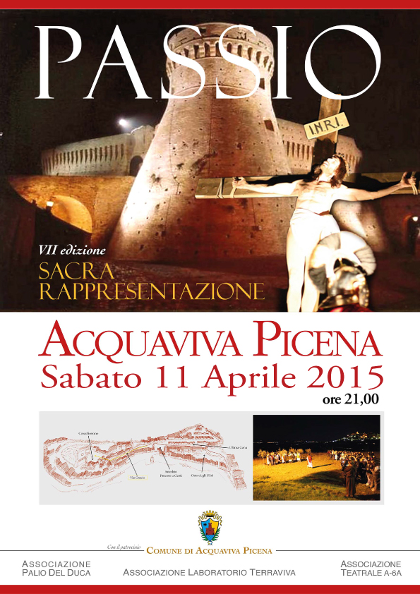 ACQUAVIVA PICENA – Le associazioni Terraviva e Palio del Duca di Acquaviva Picena, organizzatrici della settima edizione della Sacra Rappresentazione “Passio”, comunicano che, a causa di imprevisti organizzativi, la rappresentazione programmata per sabato 28 marzo è spostata a sabato 11 aprile 2015 dalle ore 21,00 centro storico.