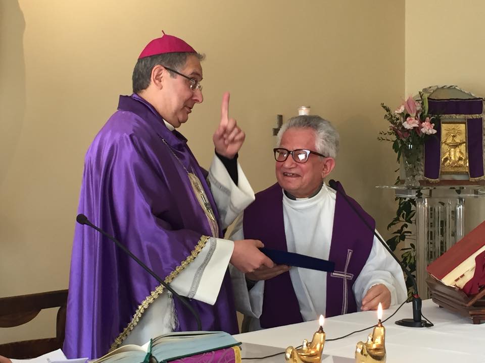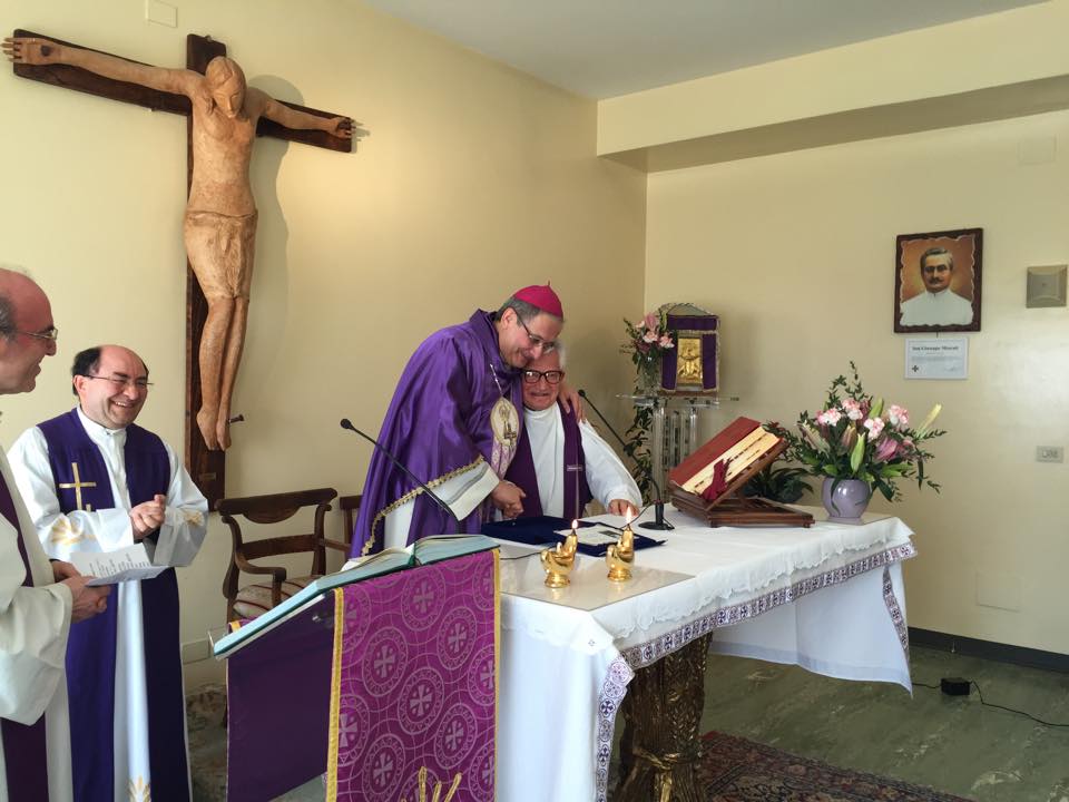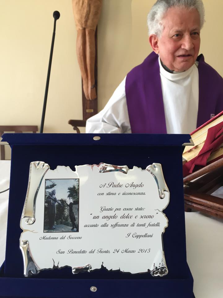 Prima della conclusione della celebrazione P. Gabriele Di Nicolò e P. Silvano Nicoli, ringraziando Mons. Bresciani e tutti i presenti, hanno colto l’occasione per consegnare una targa di ringraziamento a Padre Angelo, storico cappellano dell’ospedale rivierasco, per il servizio svolto negli anni passati e che continua a svolgere, alla veneranda età di 92 anni, come cappellano “emerito”.