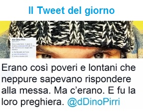 DIOCESI – A partire da oggi, lunedì 30 Marzo ogni giorno pubblicheremo nella pagina principale a destra (visibile soltanto dai computer e non dal tablet e cellulari al momento) i tweet di Don Dino Pirri, parroco della Chiesa Madonna della Speranza e conduttore di TV2000.