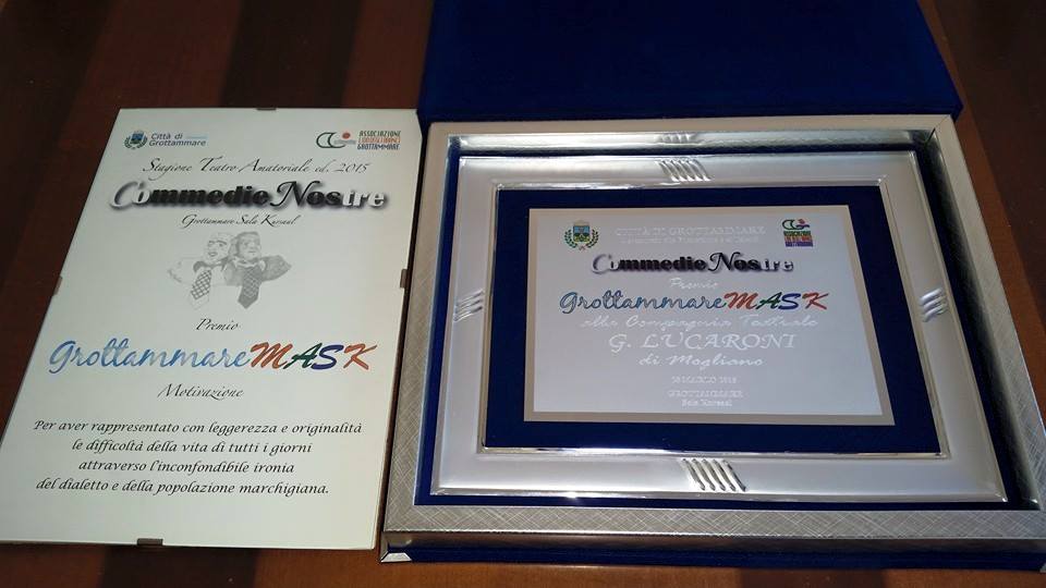 A ritirare il premio “Grottammare Mask” il regista Pietro Romagnoli, che da anni dirige un gruppo di persone appassionate, capace di rappresentare con ironia e semplicità il meglio del way of life marchigiano. Una compagnia capace di riportare il teatro a Mogliano, che prende nome dal Maestro Lucaroni, un maestro Manzi del maceratese, capace di aiutare e di limitare il problema dell’analfabetismo.