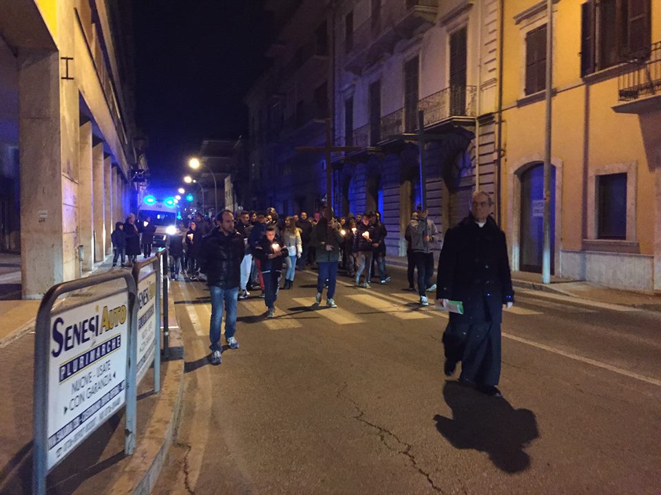 Attraversando le strade delle nostre vite, passando sotto le finestre dei nostri fratelli malati, anziani, a fianco dei portoni di famiglie in difficoltà, di cancelli chiusi alla fede, ci facciamo carico anche delle loro croci testimoniando l’importanza della fraternità e dell’unione nella preghiera che, silenziosa e piccola come uno dei nostri lumini nel buio della notte, accompagna la croce ed entra anche nei cuori di quei passanti che sono costretti a fermarsi per lasciar libera la strada della processione, invasi anche loro dalla luce di quella preghiera. La via crucis è accompagnata anche dalle poche candele sui balconcini, dalle croci luminose sulle ringhiere, dai drappi rossi alle finestre, che si fanno presenza nella preghiera di chi non può essere con noi nel corpo. Ad ogni stazione una sosta, durante la quale le invocazioni si fanno più intense e le preghiere semplici, ma evocative, sono rivolte soprattutto alle cattiverie del mondo in cui viviamo, agli uomini che vogliono spegnere l’Amore del mondo, all’egoismo di tanti, ai peccati nei quali incappiamo uscendo dalla strada della Fede.