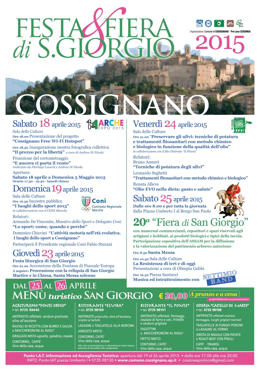 Ricco e variegato il programma della festa primaverile in cui si segnalano numerosi eventi convegnistici tecnico-scientifici che si svolgeranno presso la Sala delle Culture della residenza municipale, come “Cossignano free Wi-fi Hotspot” in programma sabato 18 alle ore 18:00 in collaborazione con Picchio in Rete – Tecnologia wireless, “I luoghi dello sport 2015” in programma per domenica 19 alle ore 16:30 in collaborazione con il CONI – Comitato regionale Marche e “Preservare gli ulivi: tecniche di potatura e trattamenti fitosanitari con metodo chimico e biologico in funzione della qualità dell’olio”, in programma per venerdì 24 alle ore 21:00 in collaborazione con l’Associazione Biodistretto “Il Piceno”. Inoltre, sempre nella Sala delle Culture sono previsti eventi storico-culturali, con l’inaugurazione di sabato 18 aprile alle ore 19:00 della mostra fotografica collettiva “Il prezzo per la libertà” e la proiezione di cortometraggio “E ancora ci porta il vento”, oltre al consueto appuntamento di sabato 25 alle ore 10:30 con un incontro di approfondimento sul tema “La Resistenza di ieri e di oggi”.