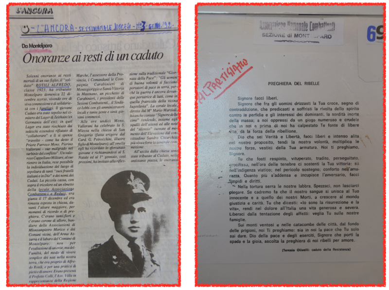 Il suo presidente maestro Onofrio Fano nel corso di lunghi anni ha raccolto, conservato e curato personalmente, con ammirabile lavoro certosino, i materiali in mostra: soprattutto foto e articoli giornalistici sul tema degli eventi bellici e affini. Il maestro, giunto alla rispettabile eta’ dei 100 anni (compiuti nel novembre scorso!), ha voluto fortemente la realizzazione di questo evento pensando al piu’ giovane dei quattro reduci combattenti montelparesi (nonche’ unico partigiano superstite): il signor Luigi Franca, “banda Paolini”, ormai prossimo (tra dieci giorni) al pure invidiabile traguardo dei 90 anni di vita! Piu’ volte ha ribadito all’amico: “questa mostra e’ stata fatta per te..”.