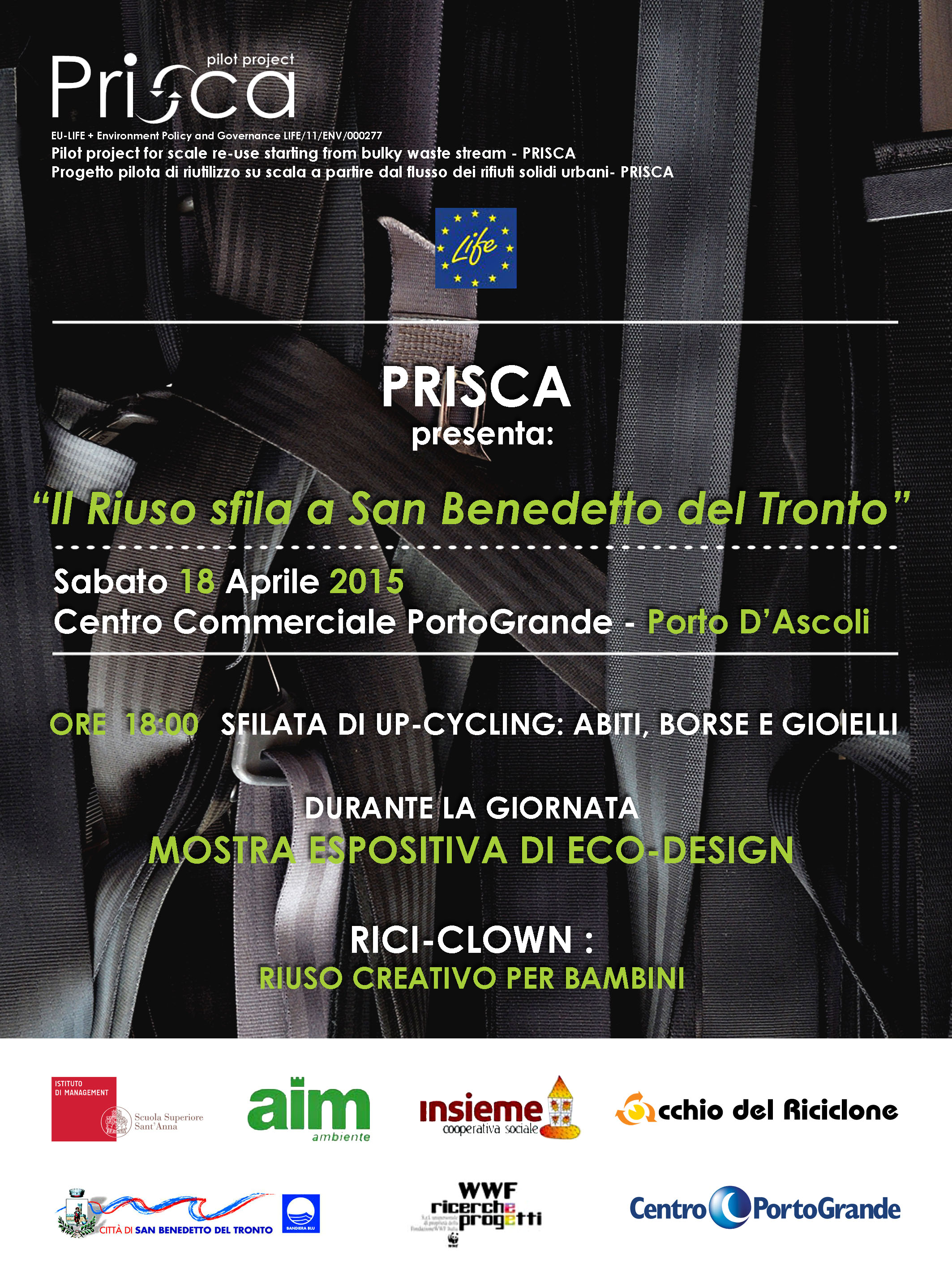 SAN BENEDETTO DEL TRONTO – Nell’ambito di PRISCA, progetto pilota di riutilizzo dei rifiuti solidi urbani, l’associazione “Occhio del Riciclone” con il patrocinio del Comune di San Benedetto del Tronto e in collaborazione con il WWF, la cooperativa sociale “Insieme”, l’AIM ambiente e l’Istituto di Management “Scuola Superiore Sant’Anna”, organizza per sabato 18 aprile al Centro Commerciale “Porto Grande” l’iniziativa “Il Riuso sfila a San Benedetto del Tronto”.
