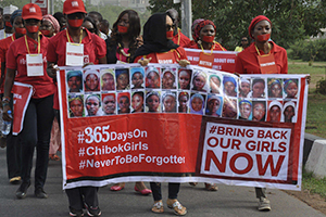 Un corteo di 229 ragazze con un nastro adesivo rosso sulla bocca e abiti rossi, per denunciare un anno di silenzio sulla sorte delle liceali di Chibok sequestrate da Boko Haram la notte tra il 14 e il 15 aprile 2014. Stanno rimbalzando in tutto il mondo le immagini della marcia di protesta che si è svolta il 14 aprile ad Abuja, in Nigeria, e i social media ne parlano di nuovo al grido virtuale di #BringBackOurGirls.