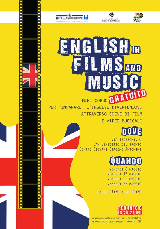 english in films and musicSAN BENEDETTO DEL TRONTO – Il CentroGiovani Giacomo Antonini, in collaborazione con la cooperativa “EOS” e con il patrocinio del Comune di San Benedetto del Tronto, organizza un mini – corso di lingua inglese per ragazzi e giovani dai 14 ai 35 anni dal titolo “English in films and music”.