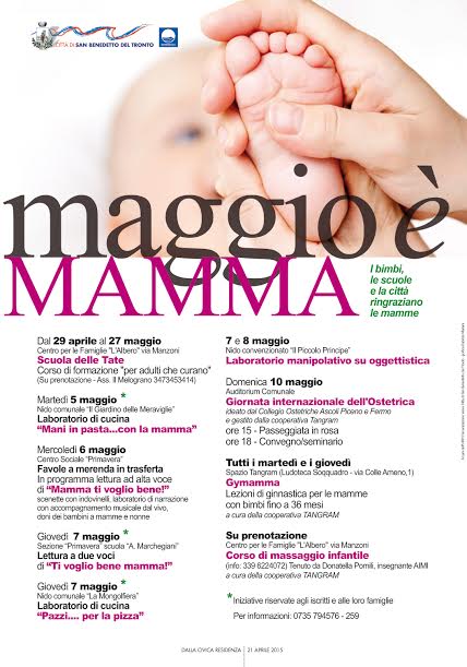 SAN BENEDETTO DEL TRONTO – Per il mese di maggio, il Comune di S. Benedetto del Tronto, in collaborazione con la cooperativa Tangram, con il Centro per le famiglie “L’Albero” di via Manzoni, i nidi comunali e la sezione “Primavera” e il Centro Sociale “Primavera”, propone un ricco calendario di iniziative dedicate alla mamma dal titolo “Maggio è Mamma”.