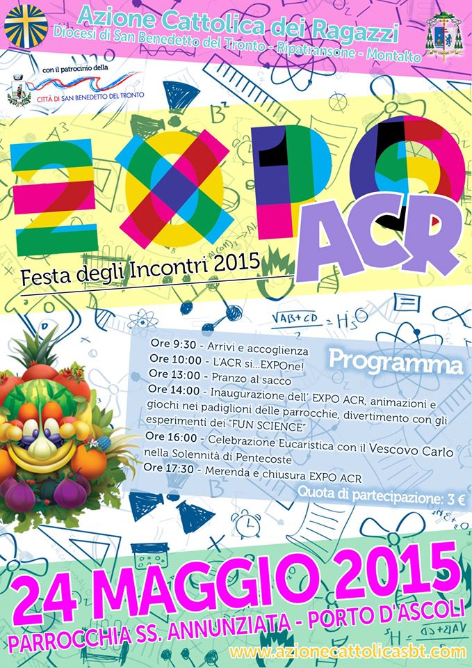 La Festa degli Incontri trasformerà l’Annunziata, per un giorno, in un grande EXPO ACR 2015: i gruppi parrocchiali potranno esporre in un proprio “padiglione” tutte le belle attività e iniziative che hanno vissuto durante l’anno (Meeting della Pace, raccolta alimentare per i poveri della parrocchia, l’incontro con un testimone nelle attività di gruppo, giochi, cartelloni, ecc…). Sarà un momento di condivisione e di incontro per capire l’importanza e la gioia di condividere lo stesso cammino con altre realtà, uniti nella Chiesa diocesana. Il tutto accompagnato da animazioni, giochi e dai divertenti esperimenti che verranno condotti dai FUN SCIENCE.