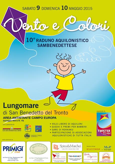 SAN BENEDETTO DEL TRONTO – Nei giorni 9 e 10 maggio, dalle 10 in poi, sulla spiaggia libera antistante l’area ex camping (giardino di Zio Marcello), l’associazione aquilonistica “Twister Team” organizza la decima edizione di “Vento e Colori”, rassegna di aquiloni a cui interverranno i migliori gruppi aquilonistici presenti in Italia.