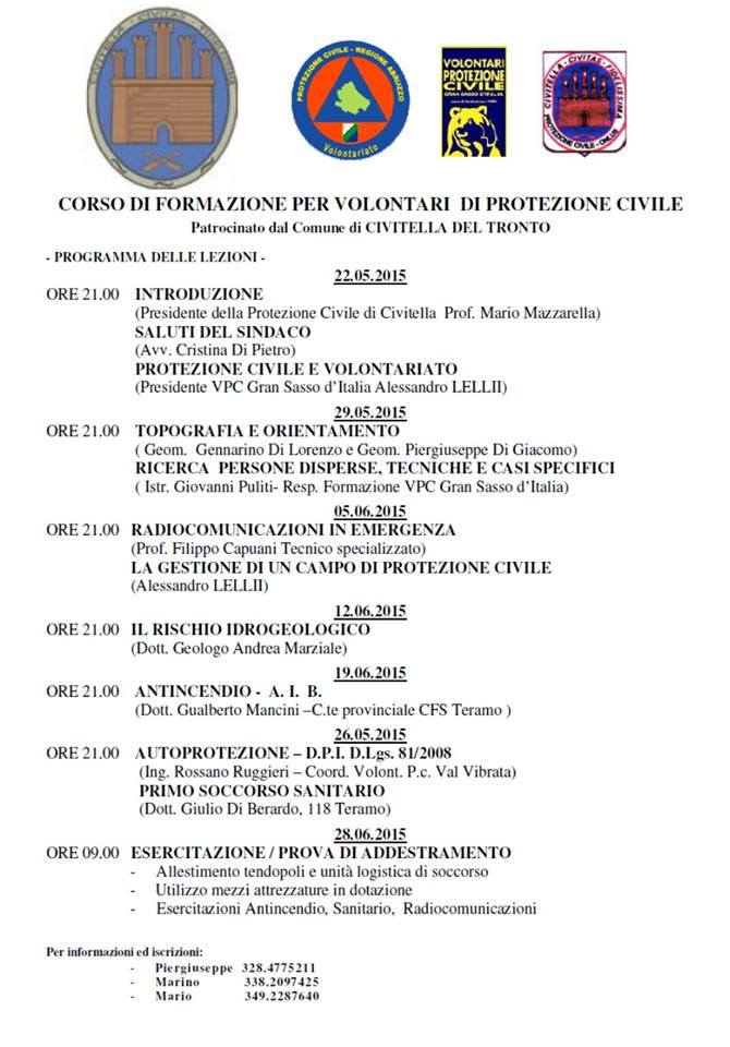 CIVITELLA DEL TRONTO – Con il Patrocinio del Comune di Civitella del Tronto, prenderà il via, il 22 maggio prossimo, il Corso di Formazione per Volontari della Protezione Civile. Il corso è gratuito.