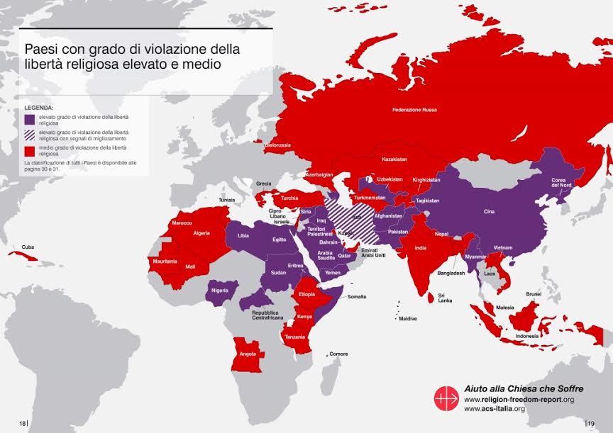 Stando ai dati dell’ultima edizione del Rapporto sulla libertà religiosa di ACS, si registrano limitazioni a tale fondamentale diritto in 116 dei 196 paesi presi in esame, ovvero quasi il 60%. I cristiani si confermano ancora una volta il gruppo religioso maggiormente perseguitato.