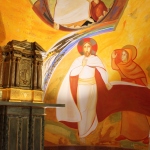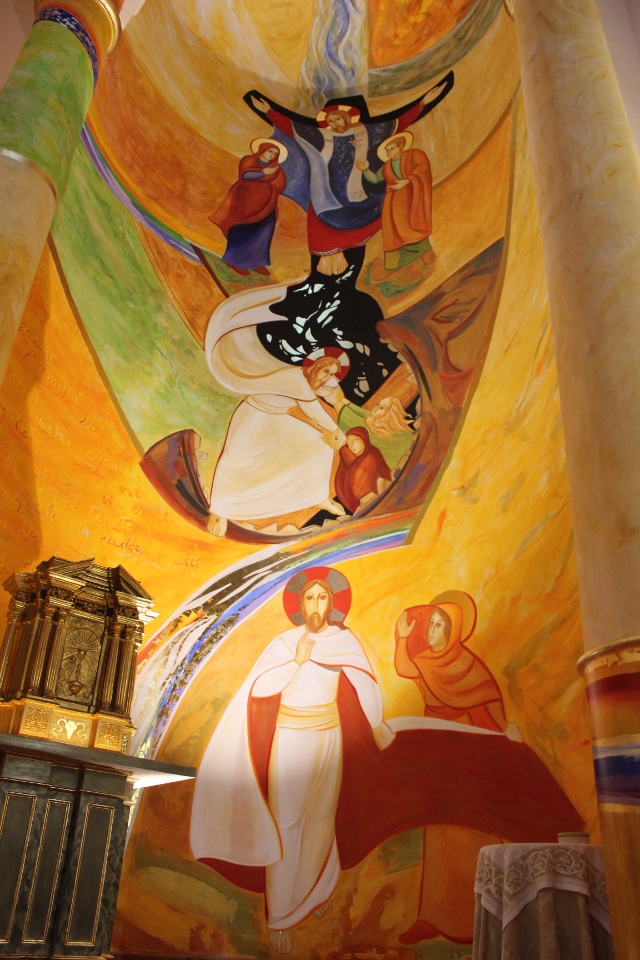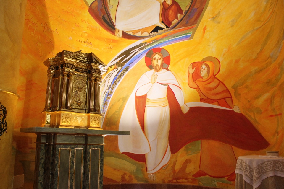 Le due absidi laterali sono ispirate a San Francesco, poiché il suo primo biografo, Tommaso da Celano, scriveva che il poverello d’Assisi amava meditare più di ogni altra cosa l’umiltà dell’incarnazione e la carità della passione. A destra perciò troviamo la passione e la morte di Gesù sulla croce, la discesa agli Inferi e la risurrezione, nel momento in cui Gesù incontra la Maddalena. Agli Inferi è raffigurata la bocca dello Sheol, il mostro: Gesù apre la sua bocca con la croce e salva Adamo ed Eva. Ritorna, in questo dipinto, il colore verde, segno della prima alleanza dell’umanità, che richiama il giardino dell’Eden, quando Dio ha creato l’uomo e la donna. È molto interessante questo verde che confluisce nelle figure di Adamo ed Eva: è come se Gesù li creasse di nuovo. La croce di Gesù inoltre è nera, perché il nero indica il nostro peccato, che scende fino agli Inferi. Gesù sulla croce è vestito da sacerdote (dono di sé agli uomini): i colori rosso e blu indicano la divinità e l’umanità. Gesù è Dio, quindi porta la veste rossa, ed è rivestito di blu, poiché Egli ha preso la natura umana. La Madonna è vestita al contrario: la sua tunica è blu ed è rivestita di rosso, perché è stata “rivestita” dallo Spirito Santo. In basso c’è l’incontro tra la Maddalena e Gesù risorto ed è molto bella l’azione tra i due: la Maddalena tira il mantello di Gesù e Lui con la mano lo vuole tirare a sé, un’azione che è ripresa anche nel vangelo quando Gesù dice “Lasciami non mi trattenere”. Maria Maddalena scopre il proprio volto e Gesù la guarda, la chiama e la riconosce. Gesù sta camminando, perché la sua resurrezione non si ferma, ma continua ed è qui. Sopra al tabernacolo ci sono poi delle parole di Francesco: “Guardate l’umiltà di Dio, nulla di voi trattenete per voi, affinché vi accolga tutti colui che a voi si dà tutto.”