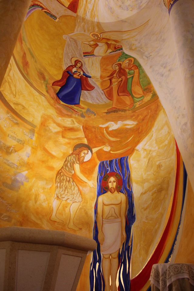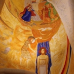 Nell’abside di sinistra, in alto, vediamo l’arcangelo Gabriele davanti ad un arcobaleno, il quale con una mano srotola la Parola a Maria, colei che incarna la Parola, nel suo grembo. L’arcangelo con una mano apre una tenda, sotto la quale sono raffigurati sua cugina Elisabetta, incinta, e Zaccaria. In basso invece troviamo il battesimo di Gesù, raffigurato insieme al Battista: Gesù è mostrato in una posa quasi cadaverica nel fiume Giordano. È lì che comincia il mistero della morte di Gesù, il quale si spoglia della sua divinità: facendosi battezzare santifica le acque del Giordano, dove sono presenti segni di oro e rosso (simbolo di divinità). Associando la posizione di Gesù a quello di un defunto in una bara si vuole indicare il suo abbassamento nella condizione umana, la sua morte.»