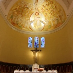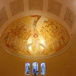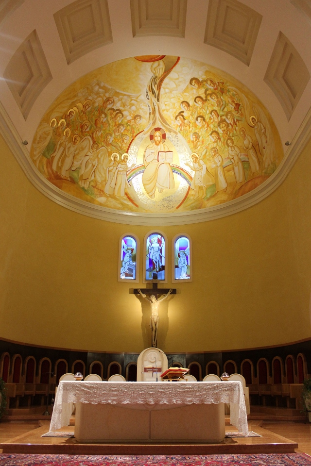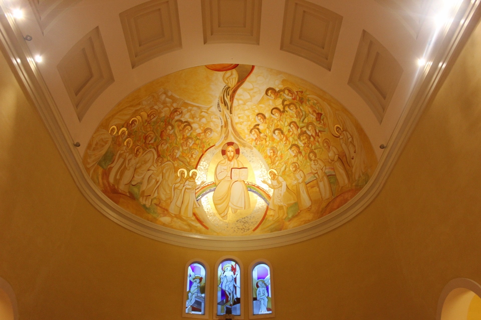 «Sulla calotta al centro, la copertura dell’abside, è rappresentato Gesù Pantocratore circondato dalla gloria dei santi. Gesù è seduto al centro di una mandorla (simbolo di preziosità), su di un arcobaleno. Questo particolare è ripreso dal libro dell’Apocalisse, mentre nella Genesi l’arcobaleno compare dopo il diluvio, segno dell’alleanza tra Dio e l’umanità. Interessanti sono le piccole casette che si vedono sullo sfondo: sono delle dimore, riferimento alla frase di Gesù “Io vado a prepararvi una dimora”. Tra i personaggi si scorgono delle foglie, appartenenti all’Albero della Vita, il quale si fa portatore di diversi significati: Gesù si presenta con un libro sul quale è scritto “Io sono la vita”, Egli è la vera vite e i tralci che sono attaccati a lui portano molto frutto; la santità produce frutti infiniti. In primo piano, sulla destra, ci sono Giovanni Battista, San Francesco, Sant’Antonio, San Massimiliano Kolbe e San Raffaele. A sinistra invece troviamo la Madonna, Santa Chiara, l’arcangelo Gabriele e i due santi protettori dell’ordine francescano secolare, San Luigi IX di Francia e Santa Elisabetta di Ungheria. In secondo piano ci sono vari altri santi tra cui San Benedetto, con in mano la palma del martirio, San Gabriele dell’Addolorata, Padre Pio, San Giovanni Paolo II; tra gli altri si scorgono anche due martiri uccisi nel 1991, due frati del nostro ordine, padre Michele e padre Zibi, uccisi in Perù dal movimento terrorista Sendero Luminoso; saranno proclamati beati nel prossimo settembre. Sopra, in alto, c’è la mano di Dio, dalla quale diparte il frutto della Redenzione, Gesù e i santi tutti; l’oro indica il dono della grazia di Dio.